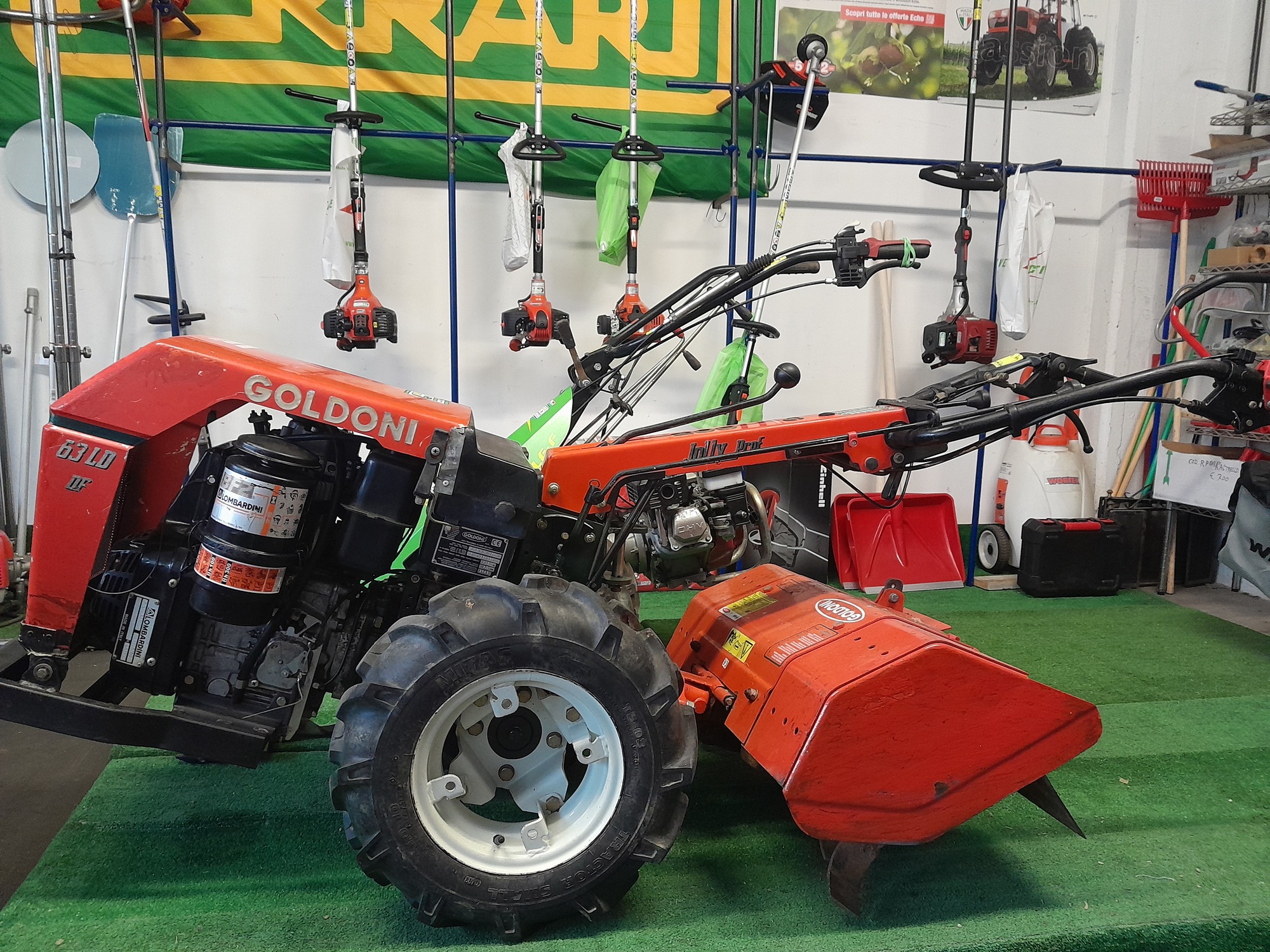 Motocoltivatore usato Goldoni modello Jolly 63 LD Prof.: motore Diesel Lombardini 6 LD 435 - 10 hp - avviamento a strappo con alzi-valvola automatica - Cambio 3+3 con inversore - Bloccaggio differenziale - ruote in gomma 5.0-10 - attacco rapido attrezzi - fresa cm 70.